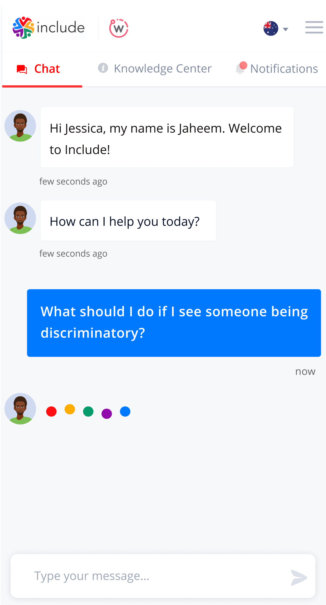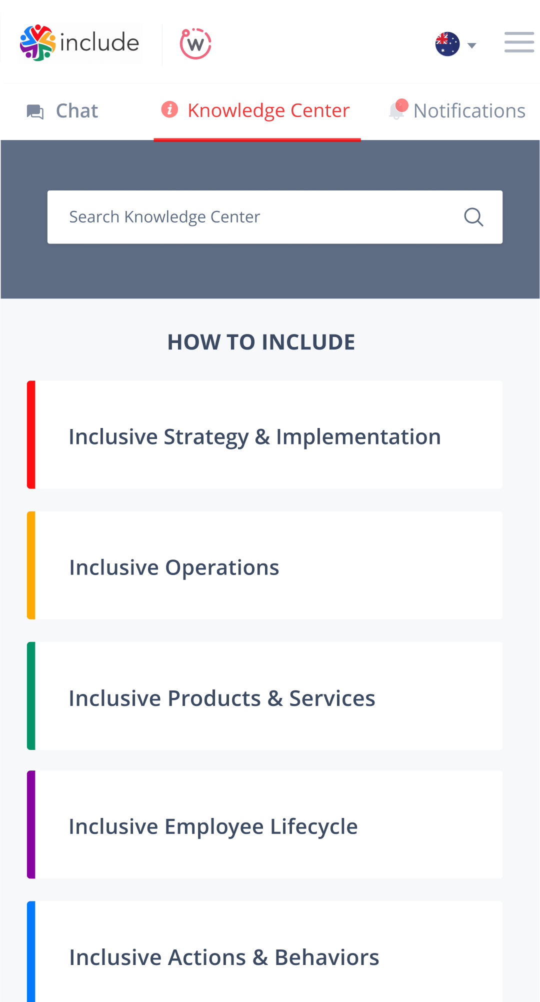 The client's vision required that the interface for end users have two essential elements: a chatbot and a knowledge center. Employees who used the app would first review the wiki-like knowledge center, which described all the components necessary to enhance a DEI culture. If they had any questions, they would turn to the chatbot for answers. If the bot could not answer, it would redirect the questions to a human advisor.